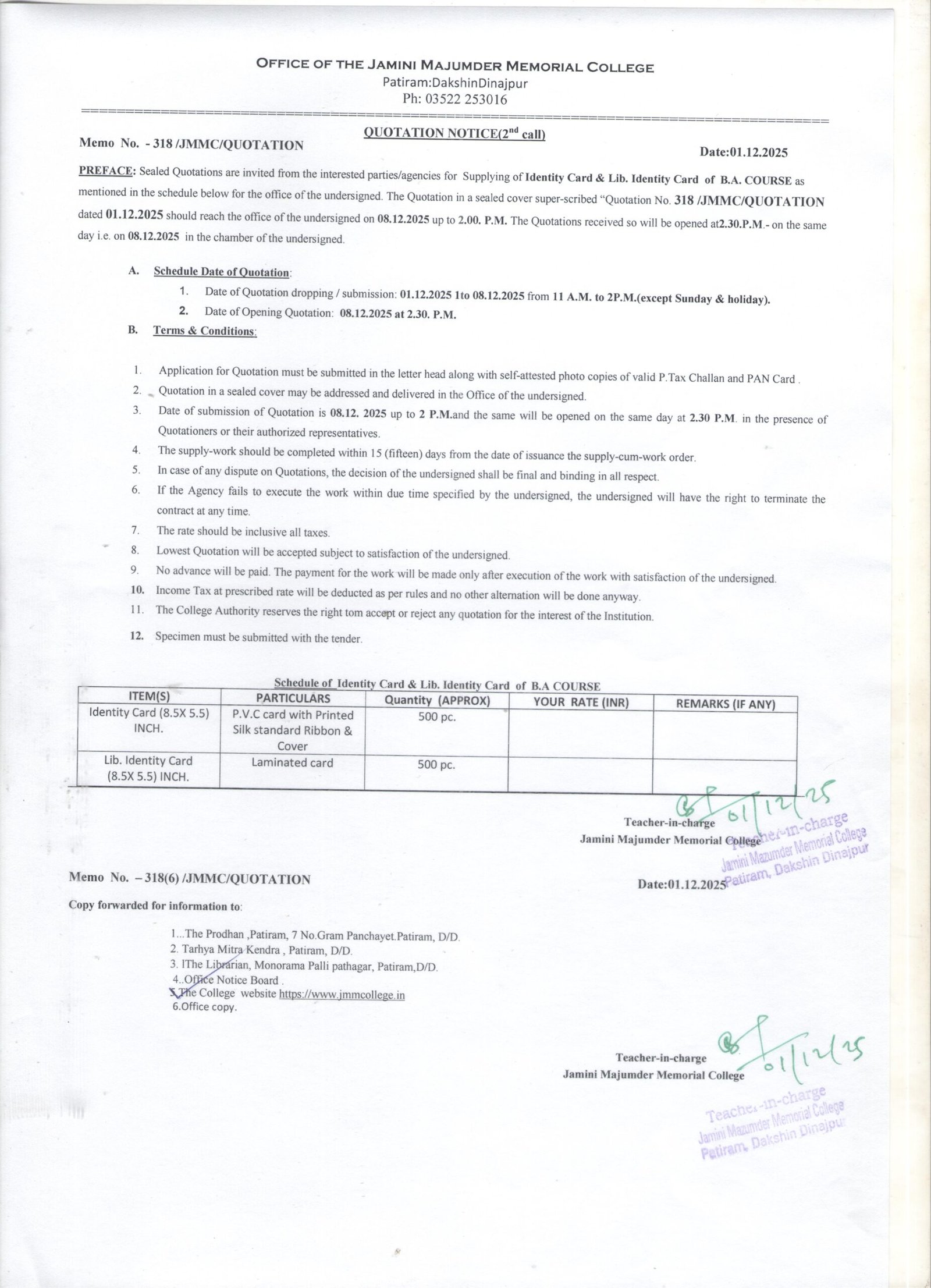 QUOTATION NOTICE ( MEMO.NO. 303/JMMC/QUOTATION)