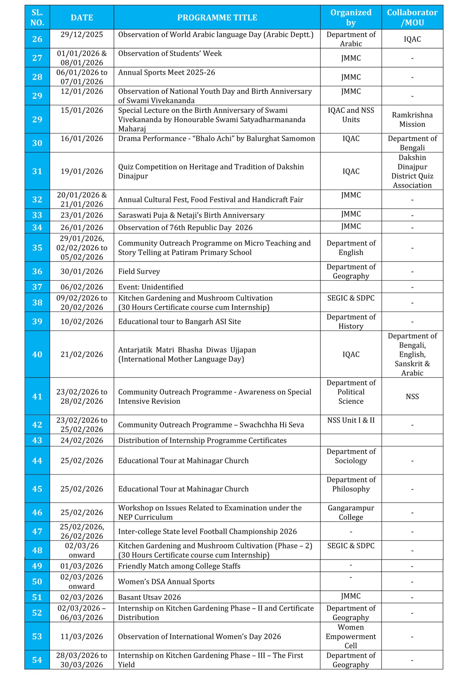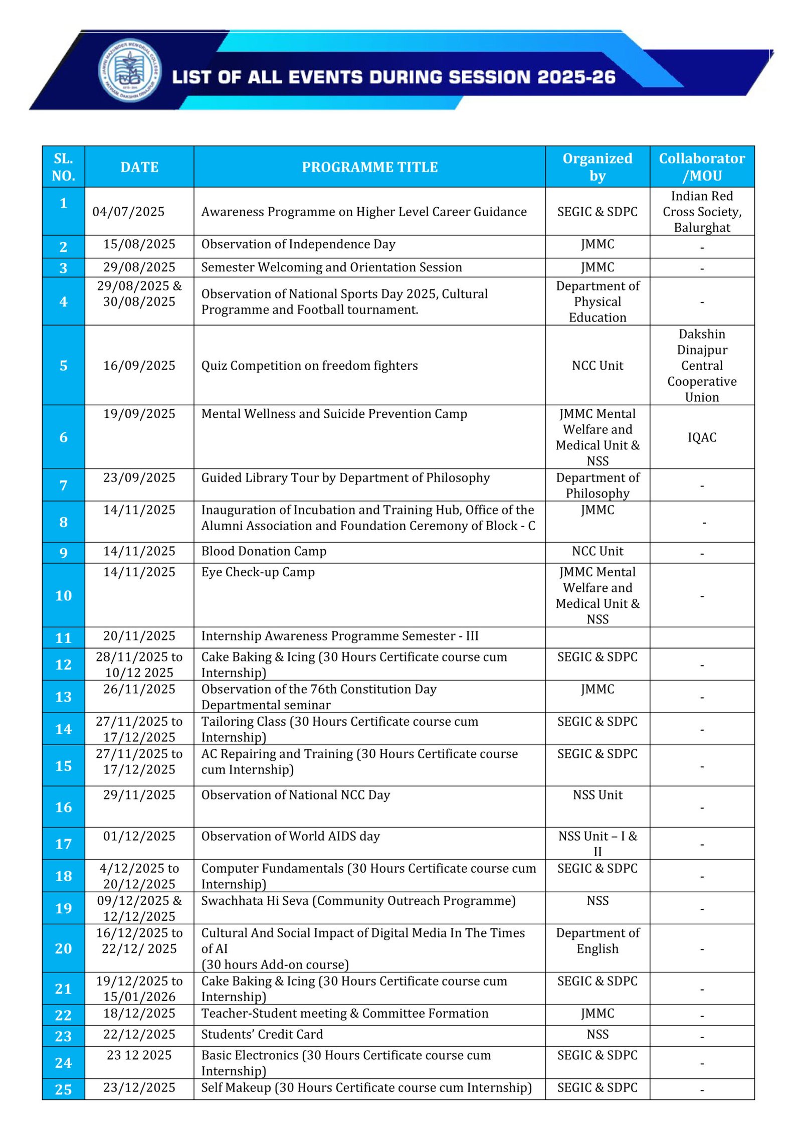 Events that took place so far during session 2025-26 are stated hereunder: