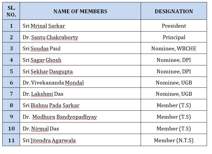 The Governing Body forms the basic backbone of the college. It is the highest body pertaining to the administration of the college headed by the President – Shri Mrinal Sarkar. The GB has currently been reconstituted on January 2018, constituting of stalwarts from all walks of life. In a very short time it has propelled the college to achieve new heights in terms of infrastructure, administration and academics.